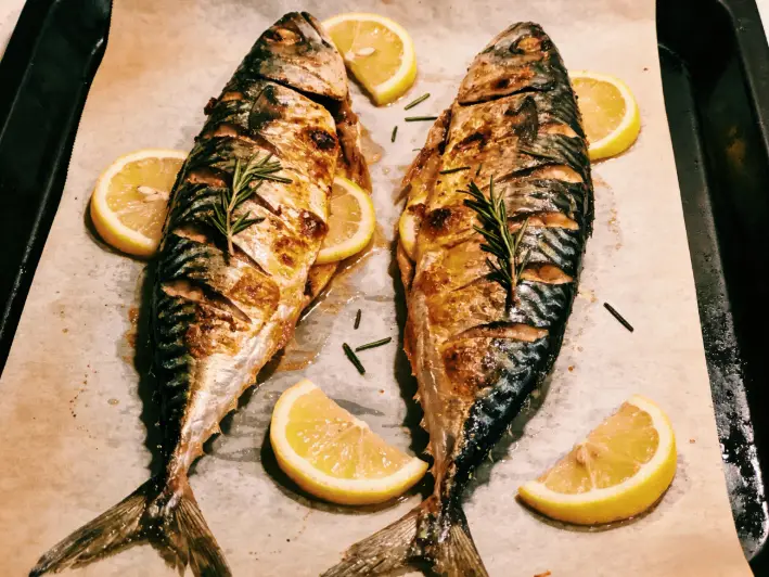 Ingredients (2 servings): 2 mackerel fillets, garlic, 2 tbsp olive oil, oregano, lemon wedges.